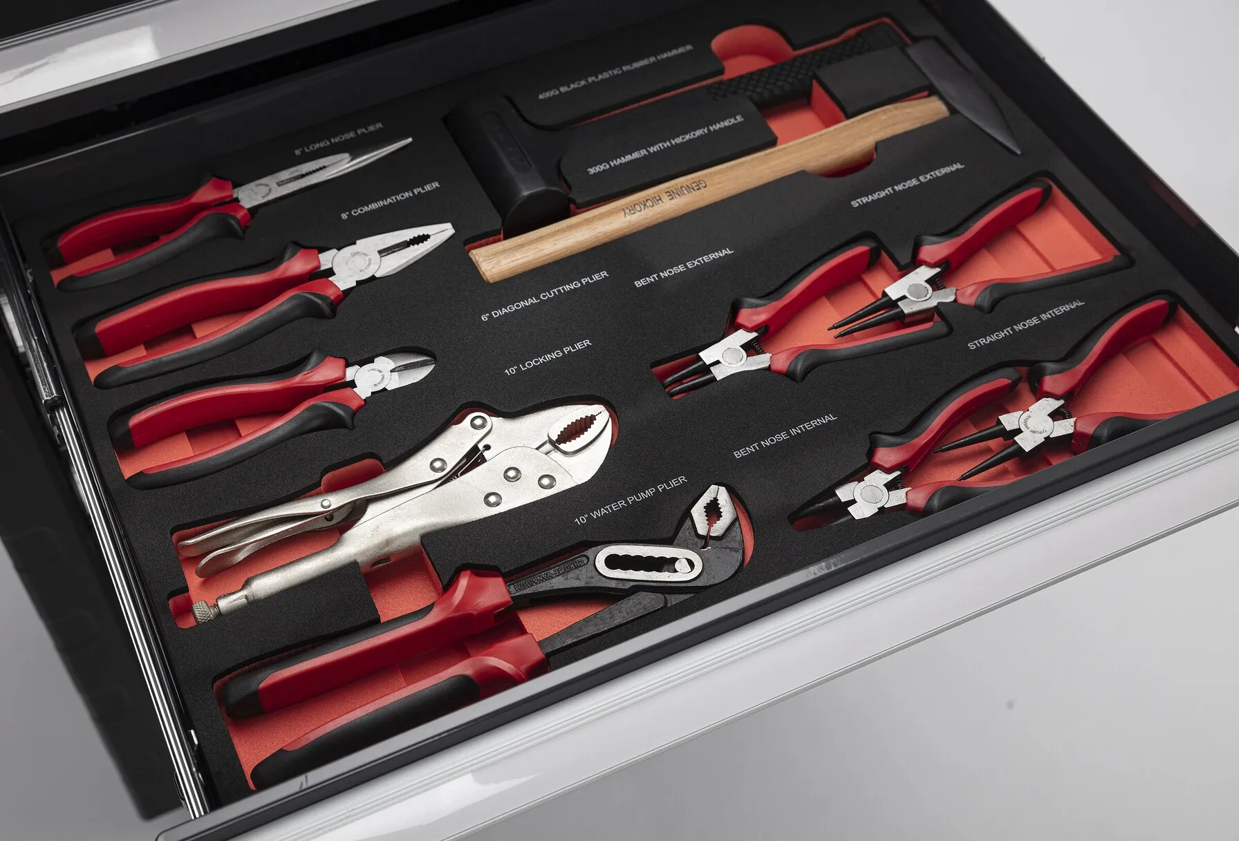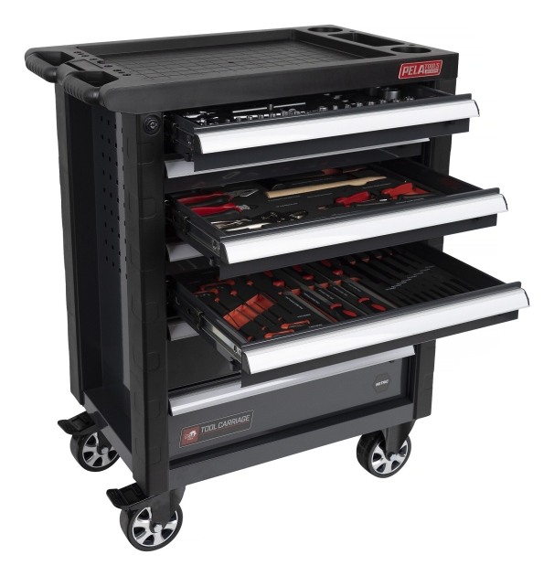 Verktygsvagn med totalt sju lådor varav sex av dessa är fyllda med verktyg som täcker det större behovet i verkstaden och entusiastgaraget. Verktygen av krom vanadiumstål är snyggt sorterade i skumgummiinlägg med bestämd plats och uppmärkning för varje verktyg. Detta hjälper en att hålla ordning i vagnen vilket besparar tid, eftersom man hellre använder verktygen istället för att leta efter dem!